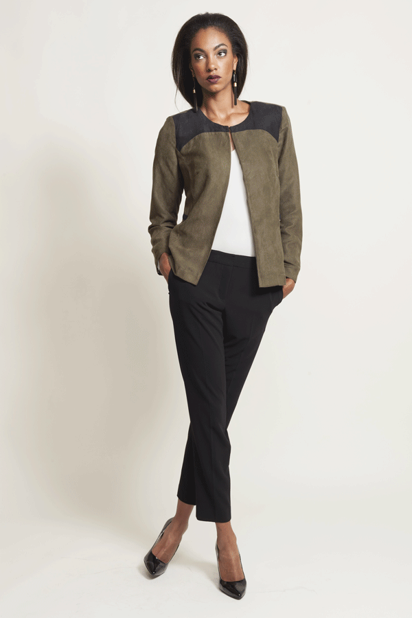 Featured in this fashion image, the background is stripped to be white. Minor cosmetic corrections are made such as blemishes and flyaway hairs. White balance, color grading and clothing silhouette is adjusted for a more refined final product.